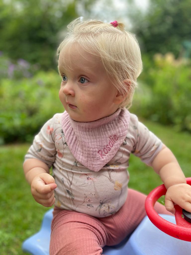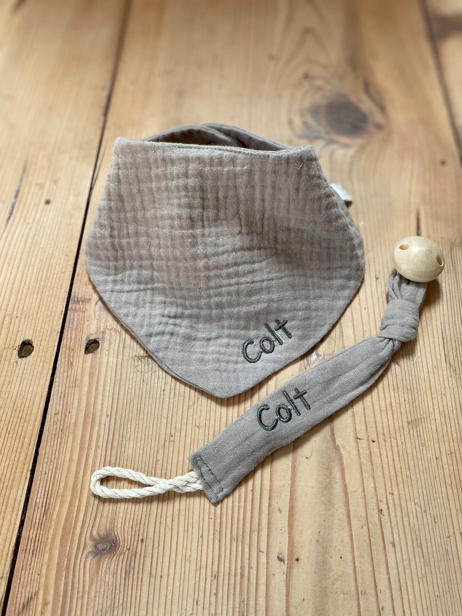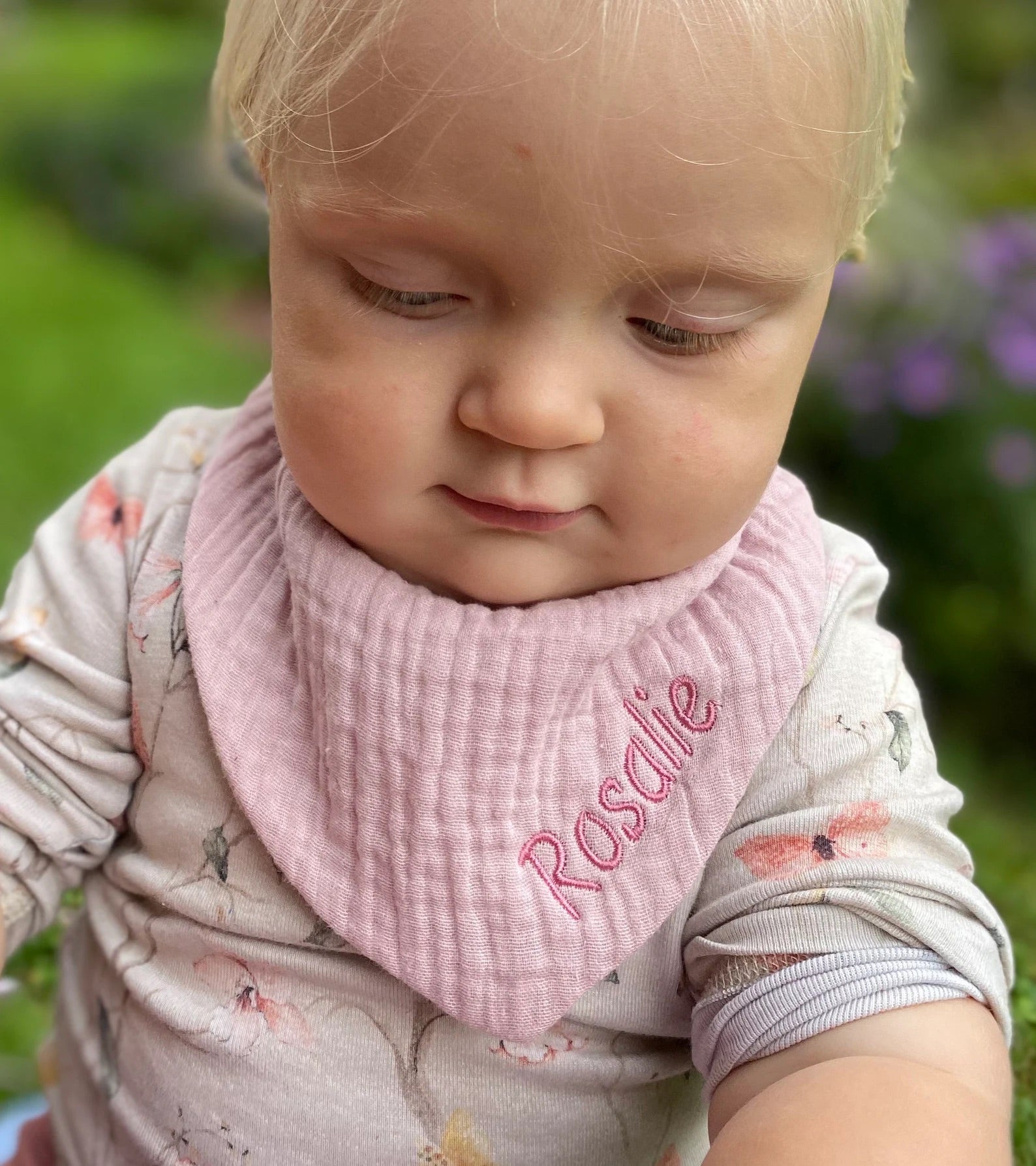 Hier habt ihr die Möglichkeit das Tuch mit eurem Wunschnamen besticken zu lassen. So wird das Dreieckstuch zum individuellen Begleiter. Tolles Geschenk für Neugeborene oder Kleinkinder. (Das Model auf dem ersten Bild ist ein Jahr alt)