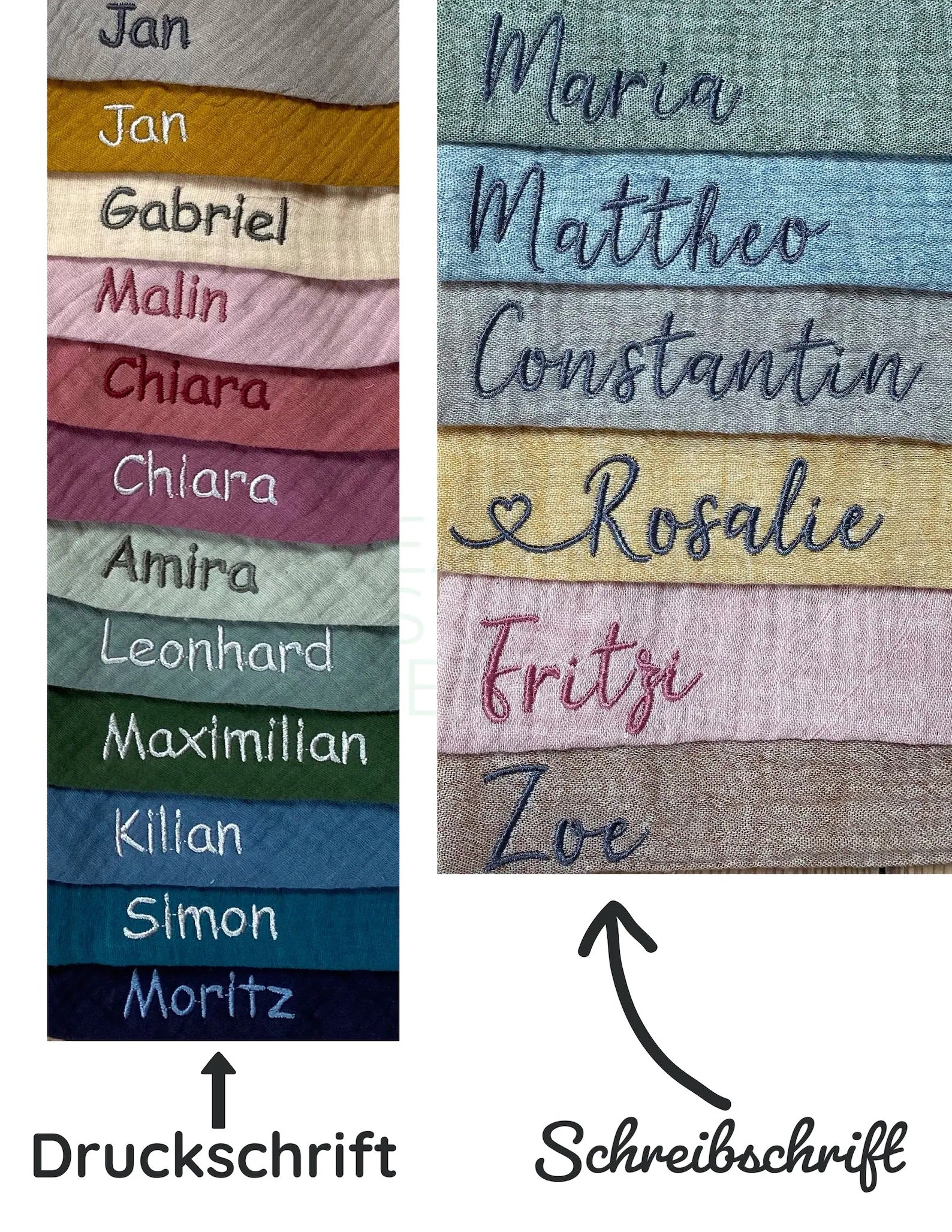 Teile uns beim personalisieren mit, ob du den Namen in Schreibschrift oder Druckschrift möchtest (wenn du nichts angibst besticken wir das Tuch in Druckschrift)